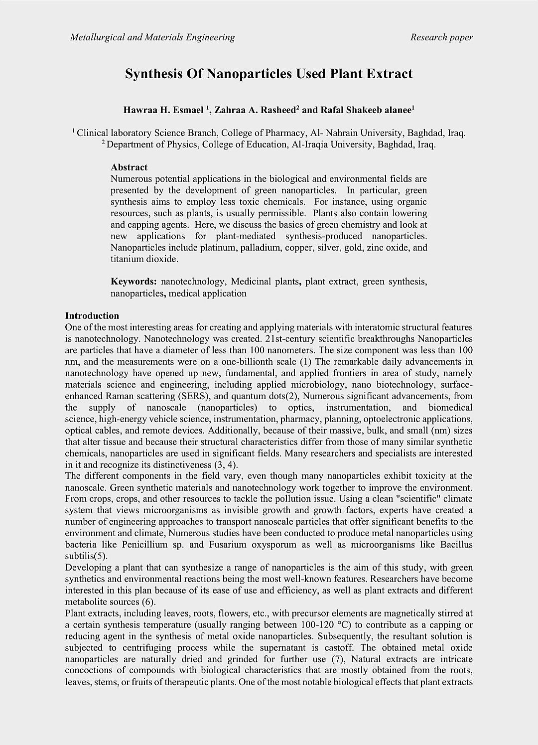 تدريسيتان من كلية الصيدلة تنشران مقالة علمية محكمة حول التخليق الأخضر للجسيمات النانوية