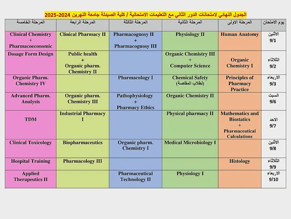 إعلان مهم كلية الصيدلة في جامعة النهرين تعلن عن جدول امتحانات الدور الثاني للعام الدراسي 2024-2025 تعلن كلية الصيدلة[…]