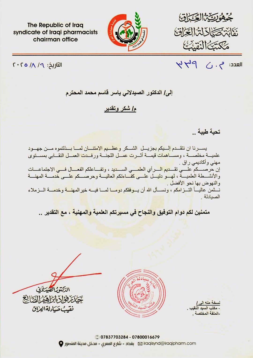 “نقيب صيادلة العراق يمنح عميد كلية الصيدلة في جامعة النهرين كتاب شكر وتقدير” منح نقيب صيادلة العراق الدكتور الصيدلاني[…]