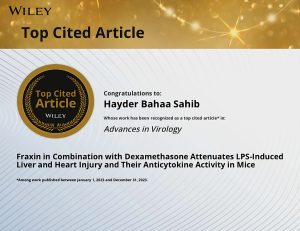 تتقدم كلية الصيدلة بأحر التهاني إلى الأستاذ الدكتور “حيدر بهاء صاحب”، عميد الكلية، بمناسبة حصوله على شهادة “Top Cited Article”من دار النشر العالمية Wiley، وذلك عن نشره العلمي المتميز في مجلة Advances in Virology.