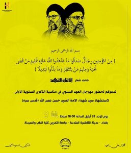 طلبة كليتي الصيدلة والطب في جامعة النهرين يقيمون مهرجاناً تأبينياً في الذكرى السنوية الأولى لاستشهاد سماحة الأمين العام لحزب الله السيد حسن نصر الله (رضوان الله تعالى عليه)