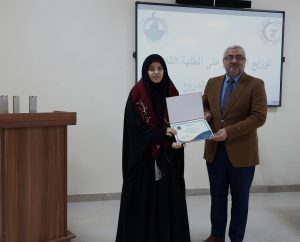واختُتم الحفل بتوزيع كتب الشكر والدروع التقديرية على الطلبة الثلاثة الأوائل على الكلية، وهم: