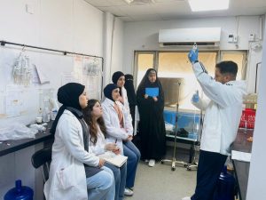 واطّلع الطلبة خلال الزيارة على آليات عمل وحدة مزج الأدوية، والإجراءات المتّبعة في تحضير الخلطات الدوائية الوريدية وفق المعايير المهنية ومتطلبات السلامة الدوائية، فضلاً عن التعرف على دور الصيدلاني السريري ضمن الفريق الصحي.