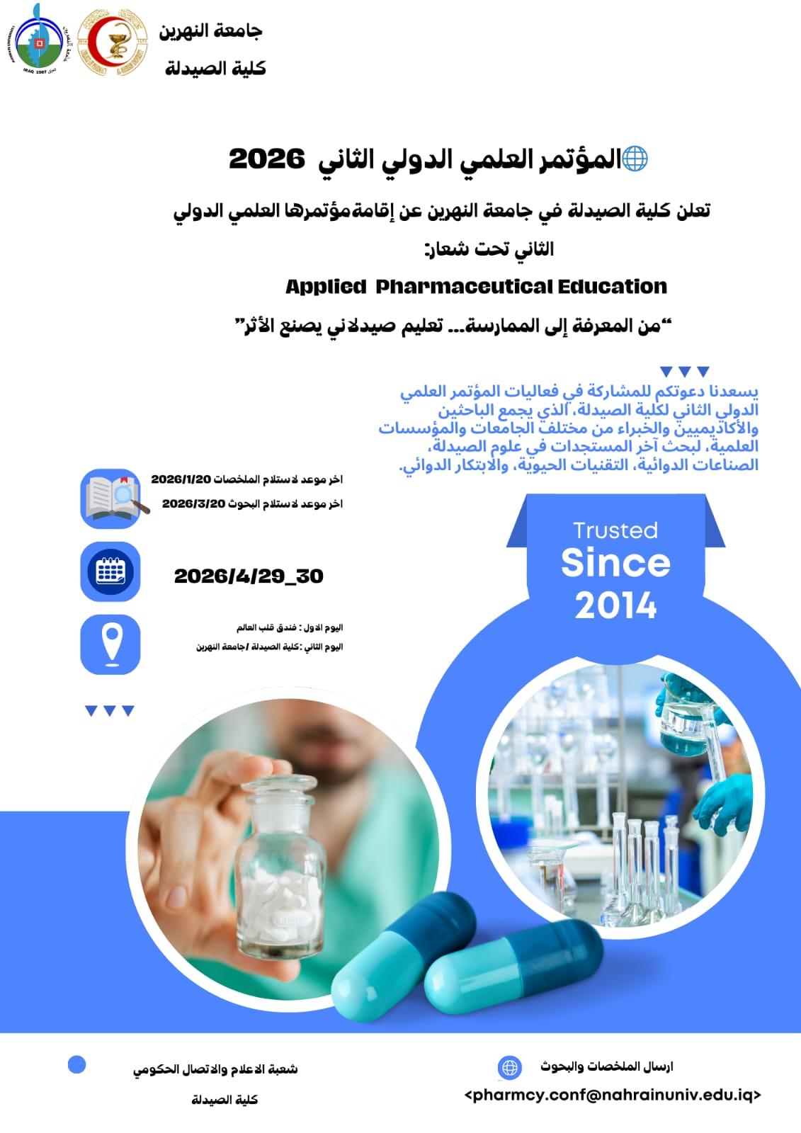 يسر عمادة كلية الصيدلة في جامعة النهرين بالإعلان عن إقامة المؤتمر العلمي الدولي الثاني،